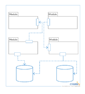 No exemplo acima, é possível observar que, dentro da mesma aplicação, o código está separado, se comunicando por interfaces bem definidas, de maneira que seja possível ter um controle mais detalhado do acoplamento entre eles, podendo até ter bases de dados diferentes para diferentes módulos.