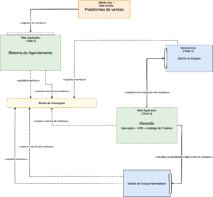 Com os bons resultados do primeiro microservice, resolvemos seguir com a extração de mais um componente, que, em teoria, seria de baixo risco e isolado. Naquela época, a Beep tinha uma modalidade de vendas baseada em marketplace: uma clínica poderia publicar sua agenda em nosso aplicativo. Isso permitia que o cliente agendasse sua vacinação e fosse até uma clínica tomar a vacina. Um problema muito importante, que precisava ser resolvido nessa modalidade de vendas, era quantificar as vacinas que poderíamos vender. Ou seja, de alguma forma, era necessário que controlássemos o estoque das clínicas disponíveis no marketplace. Assim como a gestão de equipes, a gestão de estoques do marketplace também era responsabilidade do Oswaldo. Identificamos e deixamos explícito o Bounded Context, que cuidava do controle desse estoque, e extraímos para um novo microservice. O desenho da arquitetura ficou assim: