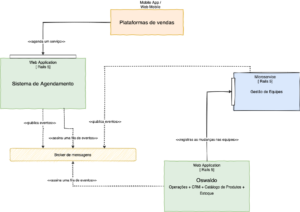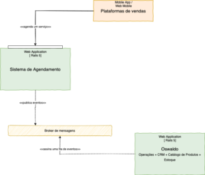As plataformas de venda se comunicam com o nosso sistema de agendamento por meio de uma Http API. Esse sistema é responsável por validar se data e horário estão disponíveis e se é possível comprar o produto desejado. Além disso, ele confirma o pagamento e publica uma série de eventos para outros subsistemas interessados. O mais importante deles é o Oswaldo, que, por sua vez, registra esse agendamento e o disponibiliza para as equipes de Imunizações, Operações e Central de Relacionamento.
