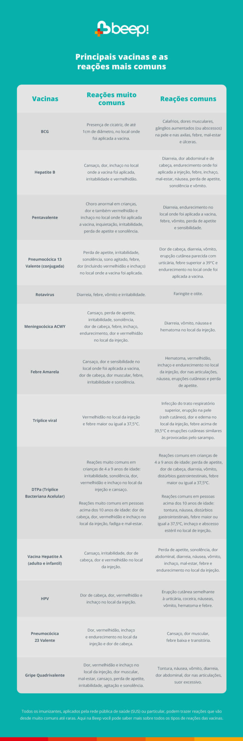 Todos os imunizantes, aplicados pela rede pública de saúde (SUS) ou particular, podem trazer reações que vão desde muito comuns até raras. Aqui na Beep você pode saber mais sobre todos os tipos de reações das vacinas.