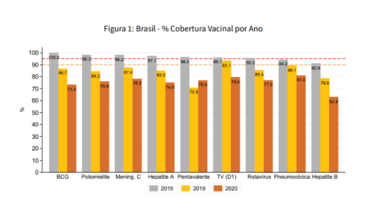 Um novo estudo publicado pelo IEPS (Instituto de Estudos para Políticas de Saúde) em maio de 2021, com base em dados do Ministério da Saúde, denuncia uma preocupante redução na cobertura vacinal de nove vacinas em municípios brasileiros: BCG, poliomielite, meningocócica C, hepatite A, hepatite B, pentavalente, TV (D1), rotavírus e pneumocócica. Todas protegem contra doenças graves, que já tiveram surtos no país e foram erradicadas.